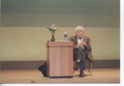 季平博道さん(住職)が主催者を代表してあいさつをおこなった後、同会のメンバー6人が尾道ことばで憲法前文を朗読。続いて、「今、思うこと」の演題でマイクを握った小田さんは、飢えと空襲の戦争体験を中心に語りながら、「日本は、殺し、焼き、乳母ツタ歴史と、殺され、焼かれ、奪われた二つの歴史を持っている。この二つの体験を止揚したのが憲法。日本のみが民主主義と平和主義を結合した憲法をもつている。憲法は、日本にとっても世界にとっても大切なもの」と訴えた。