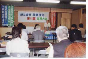 7月6日、尾道、御調、因島の党員・党友が集い第11回定期大会が持たれた。合併後初の定期大会で参加者の顔ぶれも新しくなり、また新社会党結党10周年目の記念すべき大会でもあり、清新でしかも緊張感のある大会となった。司会の三木いく子さんより、11回大会が現在の政治状況からすれば極めて重要な意義を持つものであることを強調する挨拶があり、続いて原田健書記長より、05年総括報告、06年活動方針の提案が行われた。総括に関しては、支部執行委員会は毎月きちっと行ってきたが、全ての党員にその内容を伝えることが出来ていなかったこと、また党費の本部納入が遅れていることなど執行部とそれぞれの党員の責任と自覚が薄かったとの反省が述べられた。また活動方針では、最も重要な課題として来年4月の尾道市議選と7月の参院選があり、市議選では三木いく子さん、しろま和行さんの2人を、参院選では栗原君子さんを擁立し、直ちに態勢を整え、勝利に向けて全力で取り組むことを確認した。続いて2人から決意表明がなされ、背水の陣を敷いての不退転の決意に身が引き締まる思いがし、大きな支援の拍手を送った。議長を務めた熊谷良子さんから、この大会は熱のこもったものとなったし、展望を開くことができた、との退任の挨拶があり、最後にしろま和行さんから「党勢を拡大し07年の完全勝利」に向けての“団結がんばろう”があり、記念すべき結党10周年の大会を閉じた。