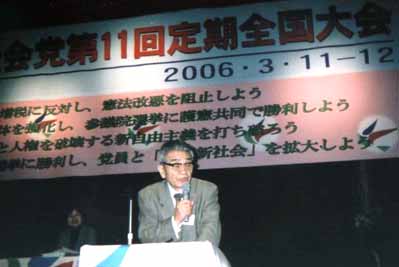 3月11・12日、東京都内で、結党10周年の節目の大会となる第11回定期全国大会が開催されました。まずこの1年間に亡くなつた同志に黙祷を捧げ、続いて栗原委員長がこの10年間を振り返り、「憲法を守るためぜひとも共闘を成功させよう。私もみなさんの先頭に立って闘う」と参院選への決意を込めて力強くあいさつ。来賓は参院議員の糸数さん、評論家の佐高さん、全労協議長の藤崎さんの3人、10周年ということで、山口元書記長、小森前委昌長、岡崎前副委員長からあいさつがありました。