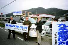 2月4日(土)に旧みよし平和人権センターに100人が集まって発会した、「九条の会・広島県北」。毎月6日の日、県北(三次市・庄原市・安芸高田市など)一体を「憲法九条を護り、今こそ活かしていこう」という街宣活動を3月からはじめました。会員のワゴン車に看板とスピーカーをとりつけ、人通りの多いスーパーなどの前何カ所かで街宣を行います。4月6日は5人の参加でしたが、それぞれがマイクをもって訴えました。